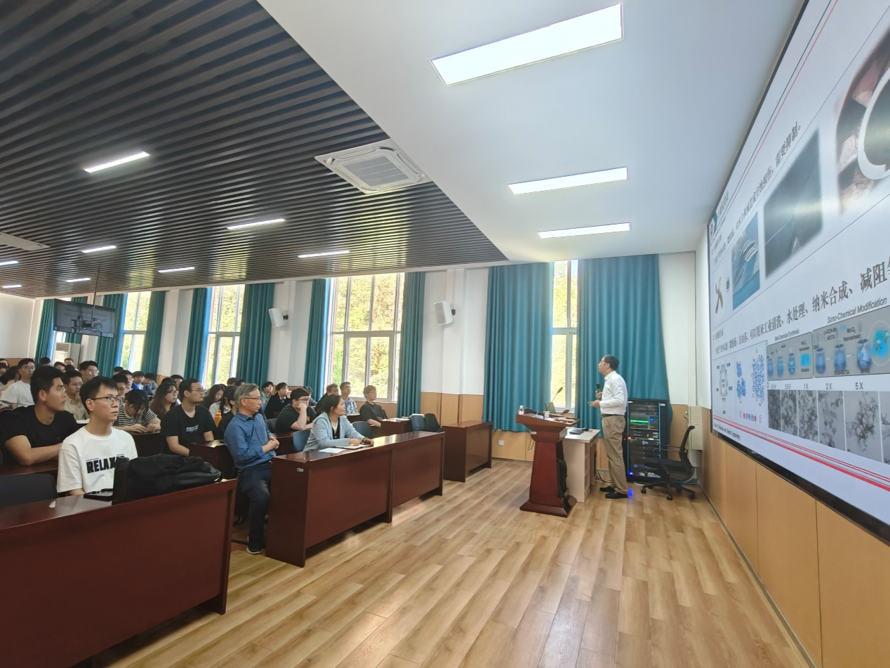 报告会上,刘峰斌教授首先介绍了空化现象的研究背景,分析了空蚀损伤的负面影响与空化在超声清洗场景的积极作用。他围绕液体环境中气核形成与气泡演化行为、不同介质中气泡的演变规律、纳米多层膜制备工艺优化、空化效应的用途以及待解决的关键问题等五大核心板块内容进行深入阐释,重点介绍了SiO₂颗粒在悬浮液中对气核形成的影响、纳米多层膜的电化学性能优化,以及荷叶表面等典型空化效应减阻应用案例,为师生呈现了一场兼具理论深度与实践价值的学术分享。